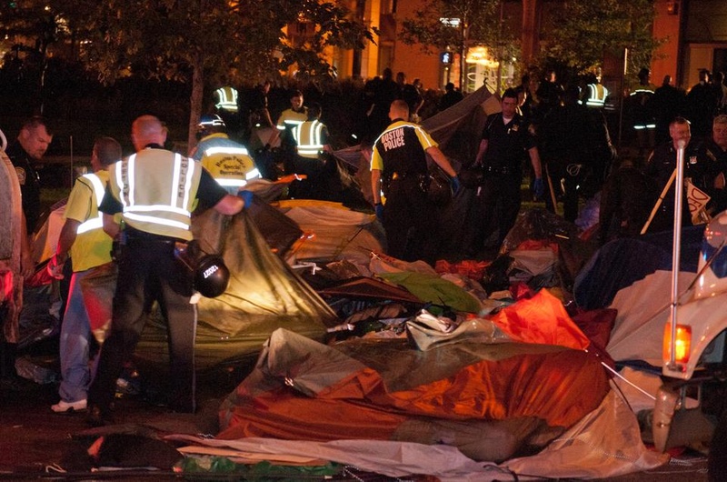 Police destroy camping gear and supplies left in the park following the arrests of Occupy Boston protesters today.