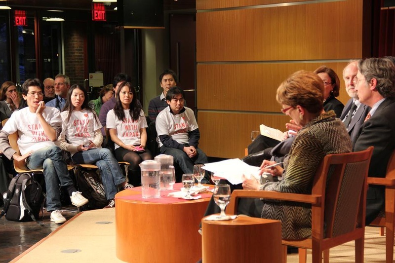 Wearing shirts with the words “Stand with Japan,” audience members listen as Harvard Professors and the Consul General of Japan discuss the recent earthquake in the John F. Kennedy Jr. Forum at the Kennedy School of Government.