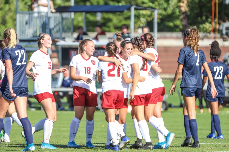 Schenk and teammates celebrate seconds after a goal by then-first-year Gabby DelPico (#21) in the 71st minute against Penn on Sept. 28, 2019. The strike would end up putting Harvard on top 1-0 in its first Ivy League conference game of the season.