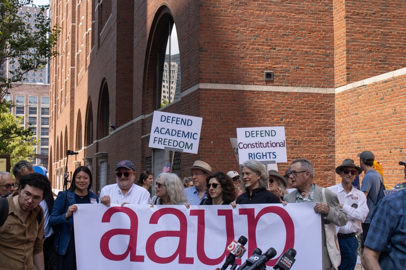 Harvard faculty and alumni gather behind an American Association of University Professors banner at a rally outside the last day of trial in the AAUP’s lawsuit over the Trump administration’s attempts to deport pro-Palestine activists. The rally was hosted by the AAUP and Harvard alumni group Crimson Courage.