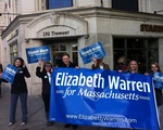 A group of Warren supporters from the Massachusetts College Democrats wave to passers-by and solicit honks of approval at the conner of Boylston and Tremont Street in downtown Boston on Saturday afternoon.